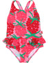 Sød badedragt til børn i fine røde og lyserøde nuancer og med det sødeste mønster af store hindbær. Badedragten er perfekt til små vandhunde, der glæder sig til en tur på stranden eller til at hoppe i bassinet i svømmehallen.