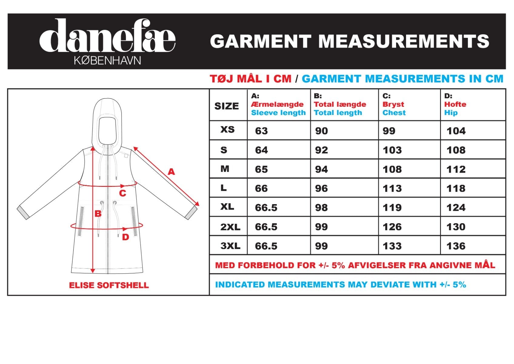 XS 90 cm, S 92 cm, M 94 cm, L 94 cm, XL 98 cm, XXL 99 cm, XXXL 99 cm.